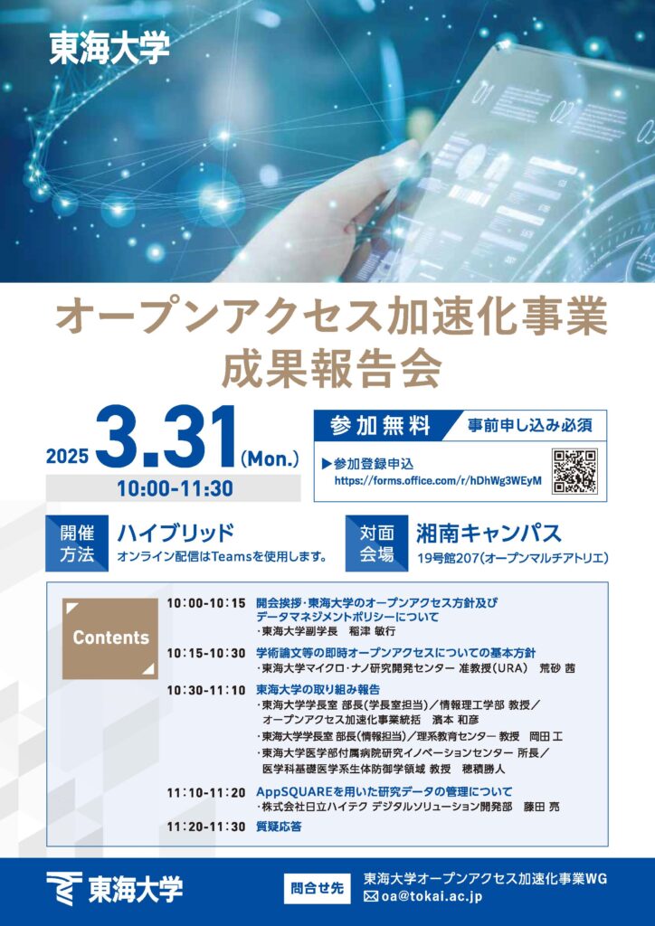東海大学が今年度に採択された文部科学省「オープンアクセス加速化事業」の成果報告会を実施いたします。